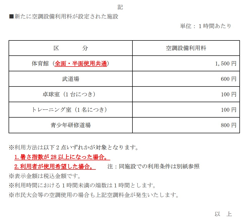 令和5年4月に日本スポーツ振興パークみらい(以下「総合運動公園」に称する)室内施設にスポーツ活動時の熱中症対策として空調設備が設置されました。令和5年6月1日より「つくばみらい市運動公園等条例(平成18年つくばみらい市条例第122号)」の改正に伴い空調設備利用料が下記の通り決定されましたのでお知らせ致します。